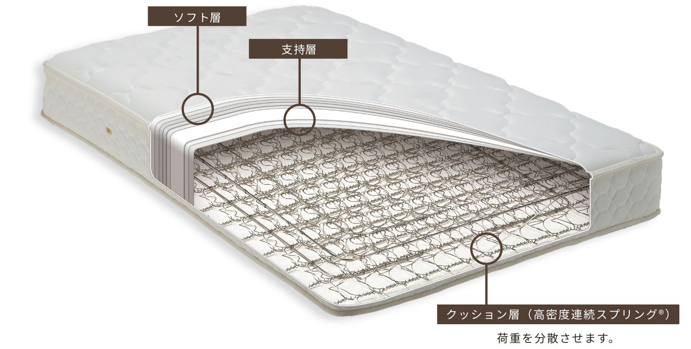 クッション層(高密度連続スプリング®) 高密度連続スプリング®︎の適度な硬さで体全体を面で支え、腰の沈み込みのない、理想的な寝姿勢をつくります。